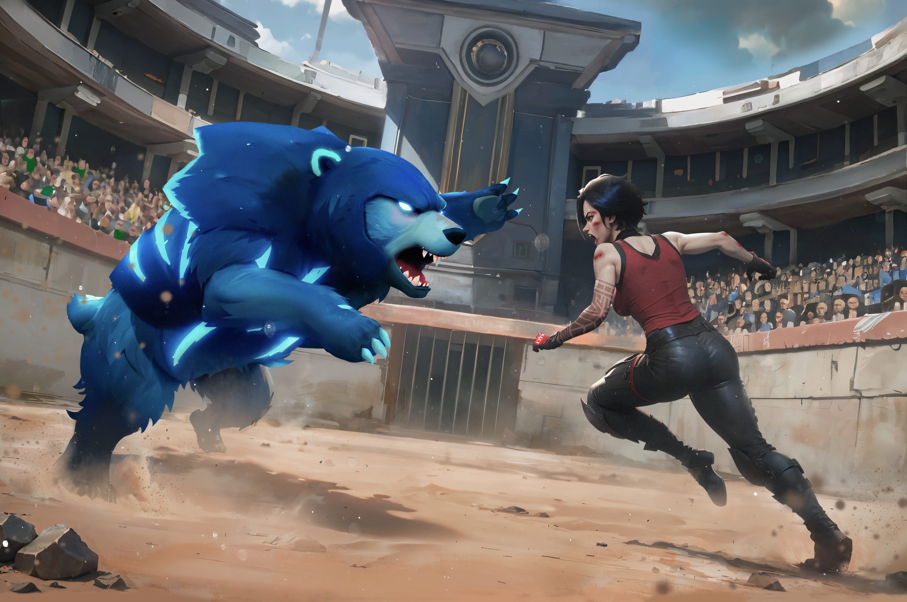 The crowd gasped as the Venari pounced... Its large claws swiped across the air; Rhianne ducked and rolled towards the Venari's hind legs. She grabbed Paloo's left leg into a lock and lifted upwards like a suplex.