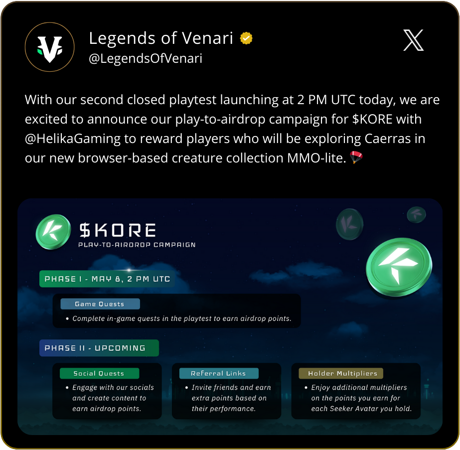 Alongside our second playtest, we have also successfully launched phase 1 of our play-to-airdrop campaign in collaboration with Helika. Check out our most recent X thread to learn how you can complete quests to start earning airdrop points!